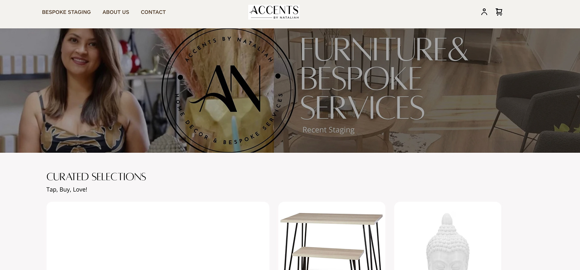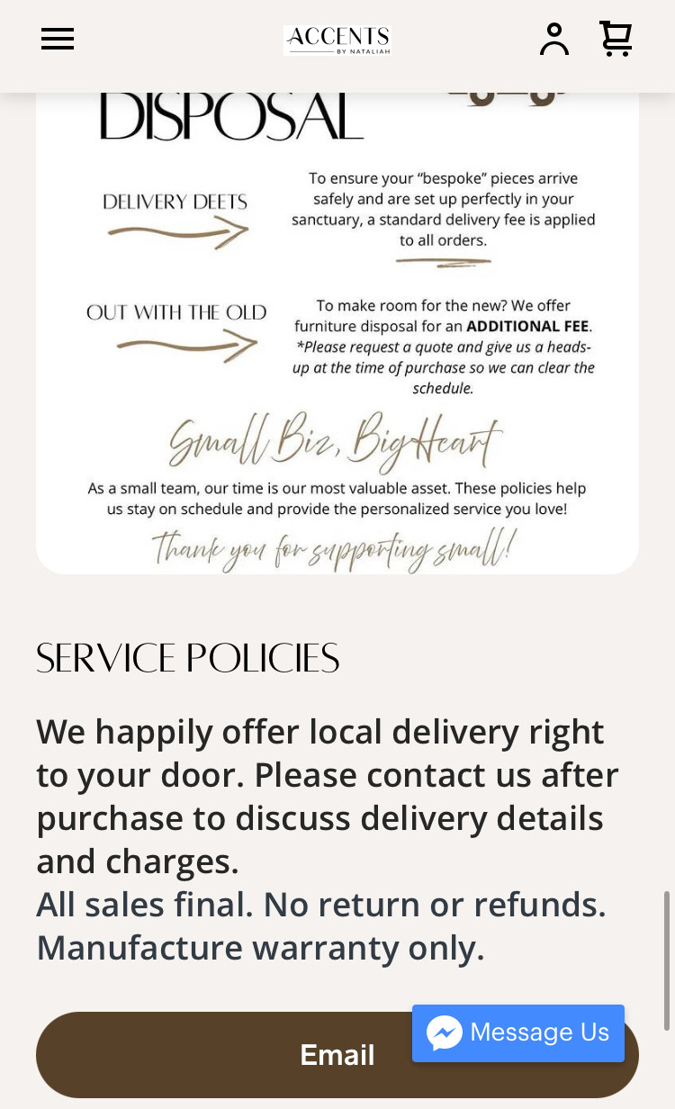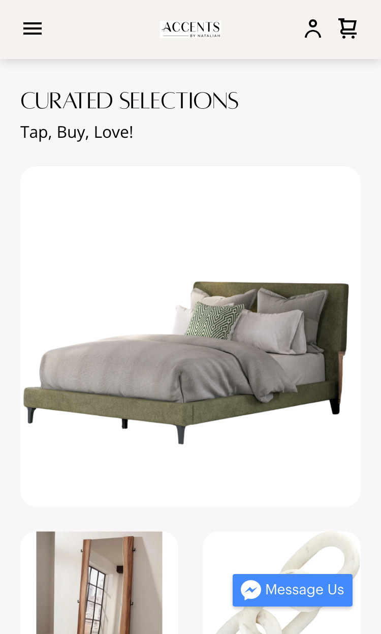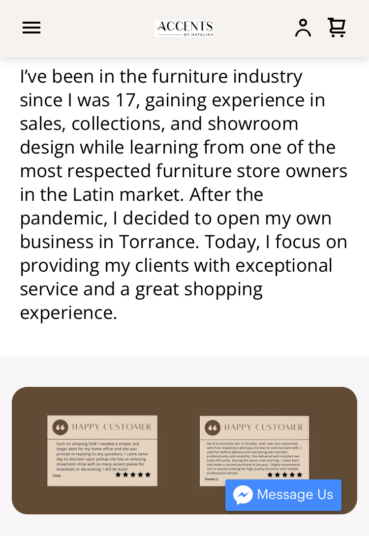 "The Client requested creating a middle ground for her furniture and staging Square website; something appealing to younger generations while simultaneously using the sleek and minimalistic business design she already had. Ultimately, the solution was to make the website simpler than it had already been, focusing more on grabbing and keeping attention. All products were moved to the front page, with 20 shown at a time instead of differing sections. The layout is similar to a board like you would find on a website like Pinterest, carefully placing all items in a way that's appealing to the eye."